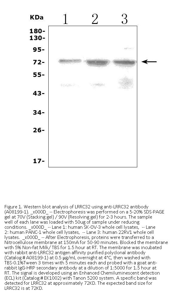 Boster Bio Anti-LRRC32 Picoband® Antibody catalog # A08199-1. Tested in ELISA, WB applications. This antibody reacts with Human. The brand Picoband indicates this is a premium antibody that guarantees superior quality, high affinity, and strong signals with minimal background in Western blot applications. Only our best-performing antibodies are designated as Picoband, ensuring unmatched performance.