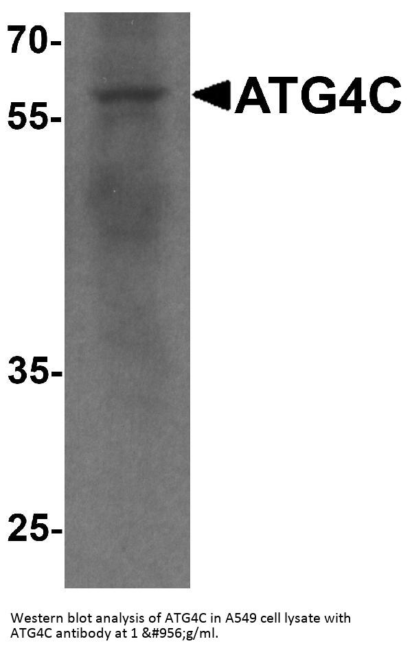 ATG4C antibody was raised against an 18 amino acid peptide near the carboxy terminus of human ATG4C. The immunogen is located within the last 50 amino acids of ATG4C.