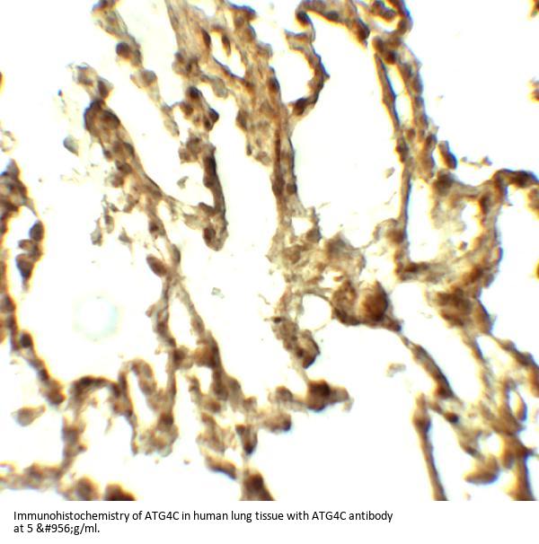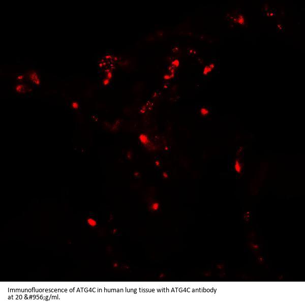 ATG4C antibody can be used for detection of ATG4C by Western blot at 1 - 2 μg/ml. Antibody can also be used for Immunohistochemistry starting at 5 μg/mL. For immunofluorescence start at 20 μg/mL.