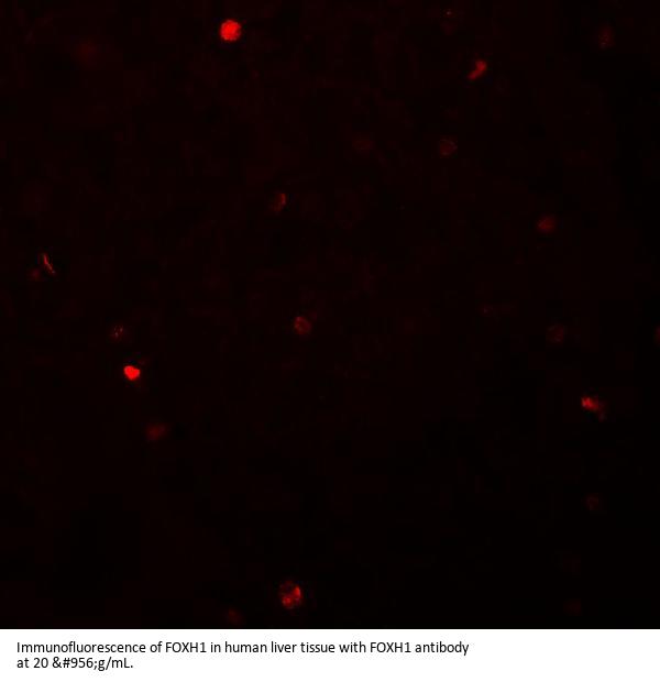Rabbit polyclonal FOXH1 antibody was raised against a 19 amino acid peptide near the amino terminus of human FOXH1. The immunogen is located within the first 50 amino acids of FOXH1.