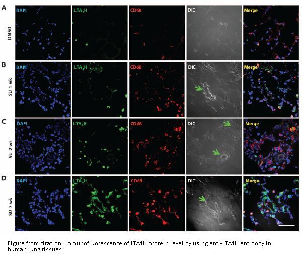 Boster Bio Anti-LTA4H (Leukotriene A4 hydrolase) mouse monoclonal antibody, clone OTI8F4 (formerly 8F4). Catalog# M02399-1. Tested in IF, IHC, IP, WB. This antibody reacts with Human, Mouse, Rat, Dog.