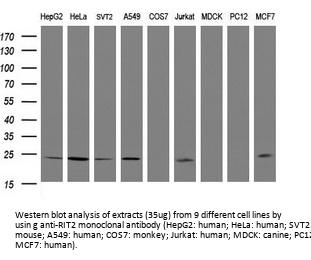 Boster Bio RIT2 mouse monoclonal antibody, clone OTI4A6 (formerly 4A6). Catalog# M07833-1. Tested in WB. This antibody reacts with Human, Mouse, Rat.
