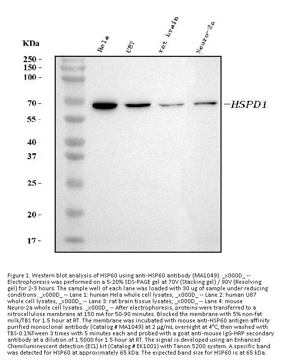 Boster Bio Anti-HSP60 Hspd1 Antibody (Monoclonal, LK1) catalog # MA1049. Tested in IHC, WB applications. This antibody reacts with Chicken, Human, Mouse, Rat.