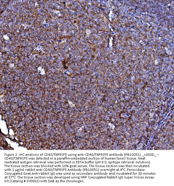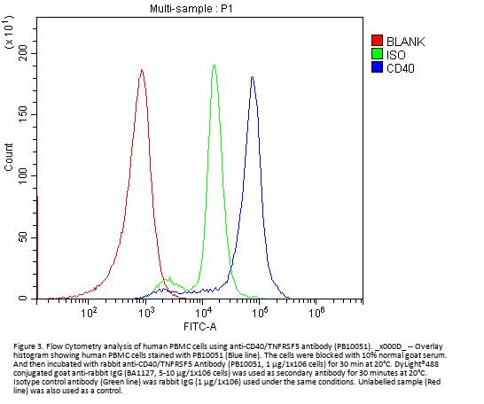 Boster Bio Anti-CD40 Antibody Picoband® catalog # PB10051. Tested in ELISA, Flow Cytometry, IHC, WB applications. This antibody reacts with Human. The brand Picoband indicates this is a premium antibody that guarantees superior quality, high affinity, and strong signals with minimal background in Western blot applications. Only our best-performing antibodies are designated as Picoband, ensuring unmatched performance.