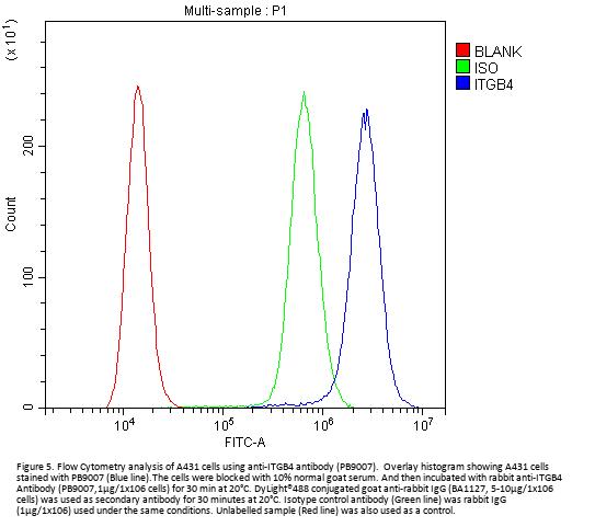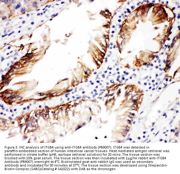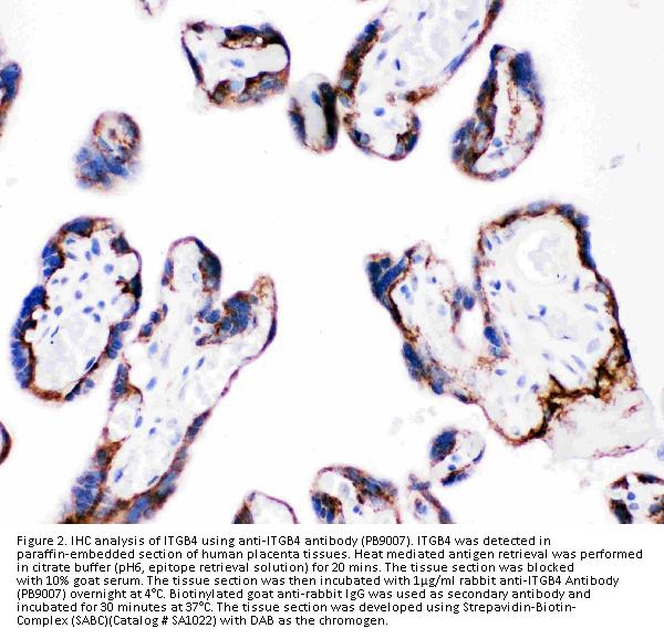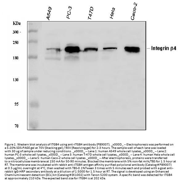 Boster Bio Anti-Integrin beta 4/ITGB4 Antibody Picoband® catalog # PB9007. Tested in Flow Cytometry, IF, IHC, IHC-F, ICC, WB applications. This antibody reacts with Human. The brand Picoband indicates this is a premium antibody that guarantees superior quality, high affinity, and strong signals with minimal background in Western blot applications. Only our best-performing antibodies are designated as Picoband, ensuring unmatched performance.