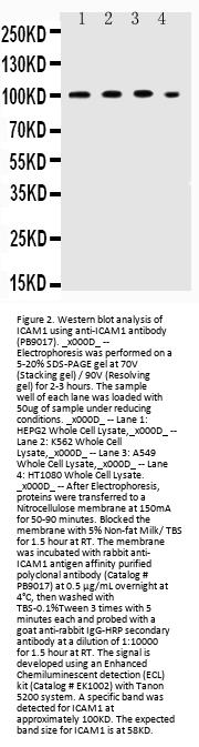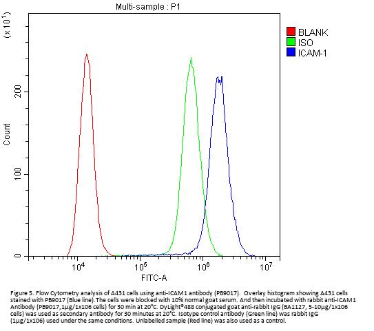 Boster Bio Anti-ICAM1 Antibody Picoband® catalog # PB9017. Tested in Flow Cytometry, IF, IHC, IHC-F, ICC, WB applications. This antibody reacts with Human. The brand Picoband indicates this is a premium antibody that guarantees superior quality, high affinity, and strong signals with minimal background in Western blot applications. Only our best-performing antibodies are designated as Picoband, ensuring unmatched performance.
