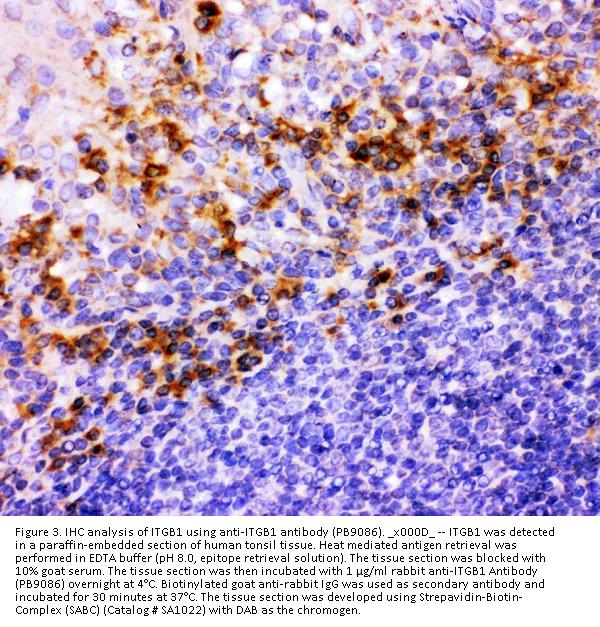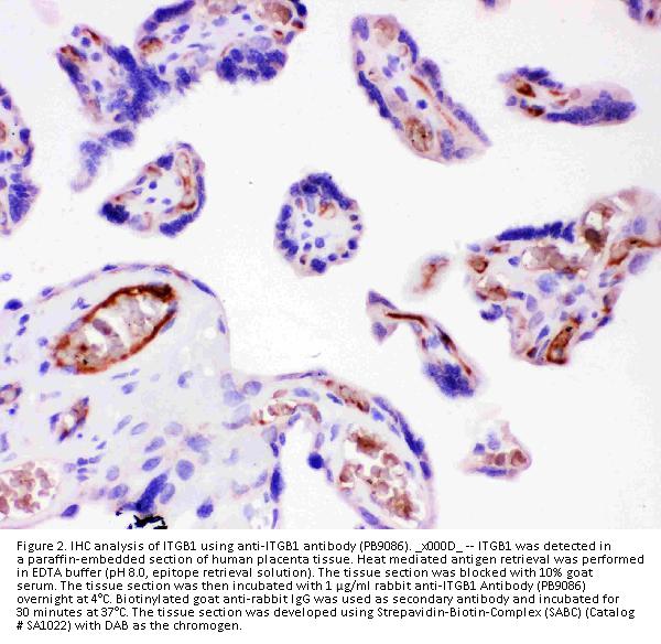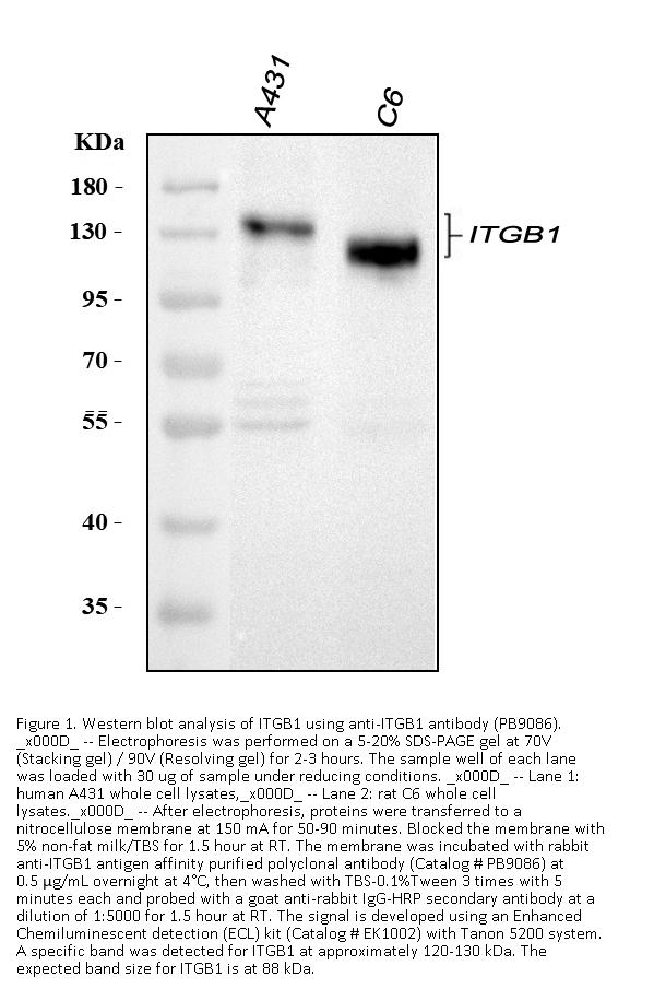 Boster Bio Anti-Integrin beta 1/ITGB1 Antibody Picoband® catalog # PB9086. Tested in IHC, WB applications. This antibody reacts with Human, Rat. The brand Picoband indicates this is a premium antibody that guarantees superior quality, high affinity, and strong signals with minimal background in Western blot applications. Only our best-performing antibodies are designated as Picoband, ensuring unmatched performance.