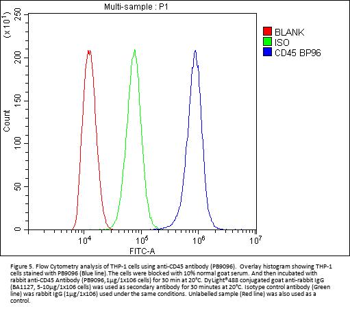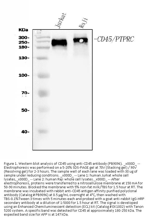 Boster Bio Anti-CD45/PTPRC Antibody Picoband® catalog # PB9096. Tested in Flow Cytometry, IF, IHC, WB applications. This antibody reacts with Human. The brand Picoband indicates this is a premium antibody that guarantees superior quality, high affinity, and strong signals with minimal background in Western blot applications. Only our best-performing antibodies are designated as Picoband, ensuring unmatched performance.