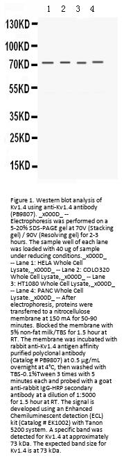 Boster Bio Anti-Kv1.4/KCNA4 Antibody Picoband® catalog # PB9807. Tested in IHC, WB applications. This antibody reacts with Human. The brand Picoband indicates this is a premium antibody that guarantees superior quality, high affinity, and strong signals with minimal background in Western blot applications. Only our best-performing antibodies are designated as Picoband, ensuring unmatched performance.