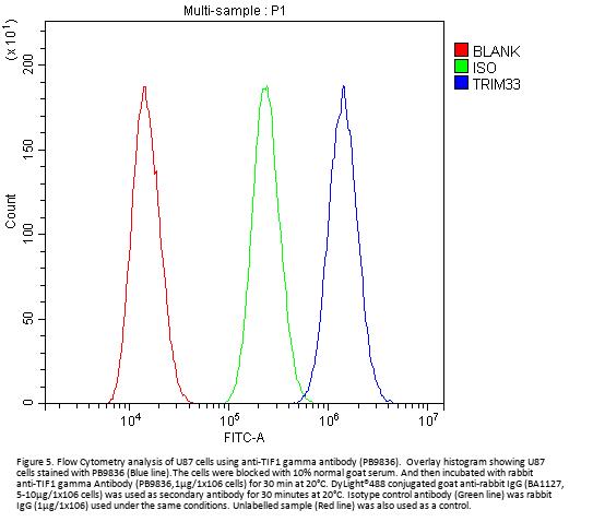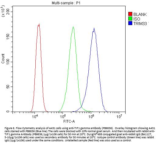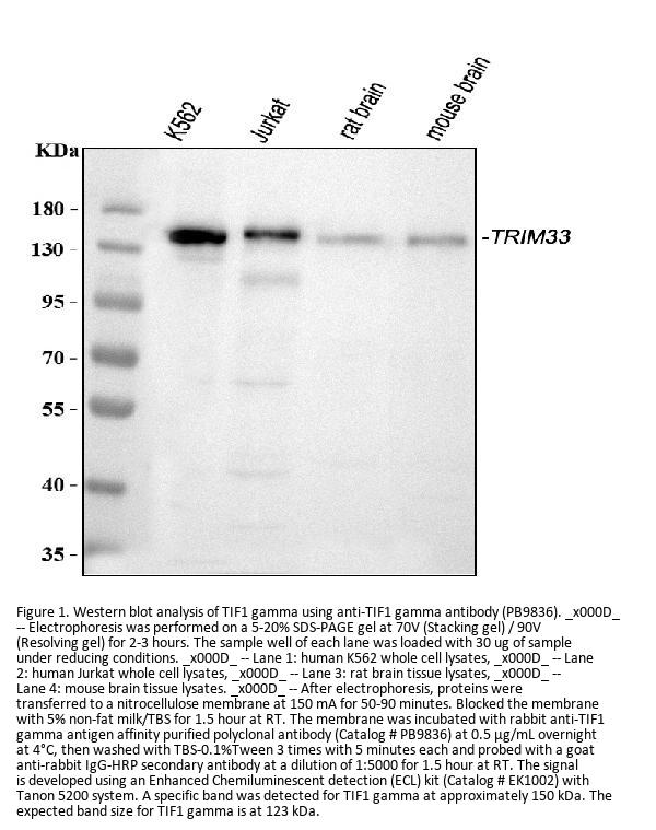 Boster Bio Anti-TIF1 gamma/TRIM33 Antibody Picoband® catalog # PB9836. Tested in Flow Cytometry, IF, IHC, ICC, WB applications. This antibody reacts with Human, Mouse, Rat. The brand Picoband indicates this is a premium antibody that guarantees superior quality, high affinity, and strong signals with minimal background in Western blot applications. Only our best-performing antibodies are designated as Picoband, ensuring unmatched performance.