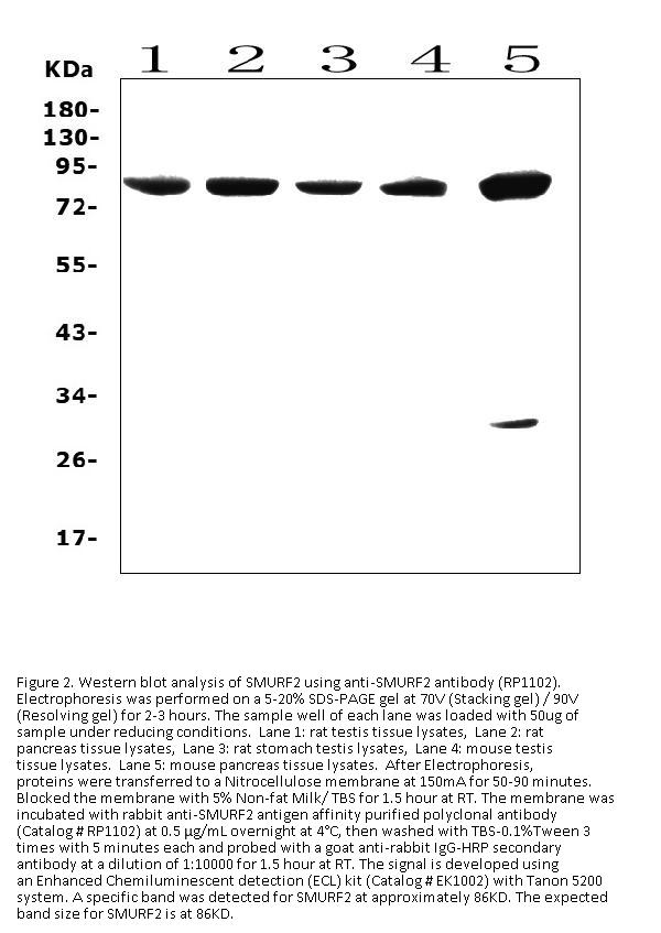Boster Bio Anti-SMURF 2/SMURF2 Antibody catalog # RP1102. Tested in WB applications. This antibody reacts with Human, Mouse, Rat. The brand Picoband indicates this is a premium antibody that guarantees superior quality, high affinity, and strong signals with minimal background in Western blot applications. Only our best-performing antibodies are designated as Picoband, ensuring unmatched performance.