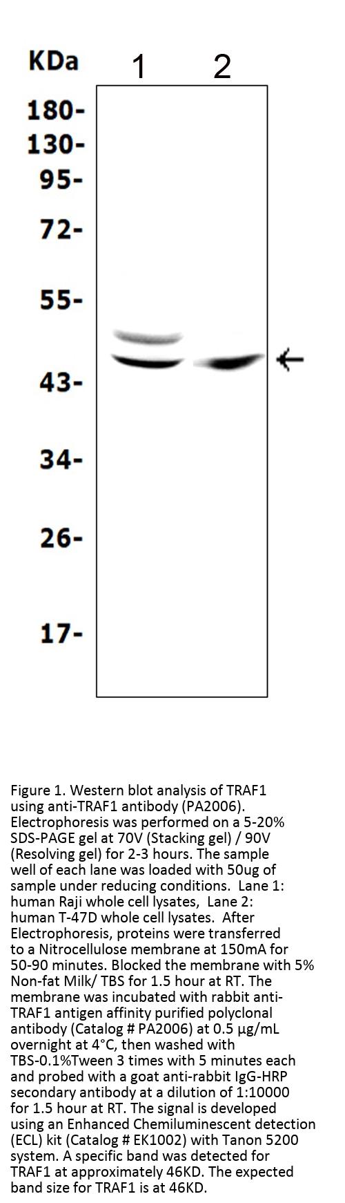 Boster Bio Anti-TRAF1 Antibody catalog # PA2006. Tested in WB applications. This antibody reacts with Human, Mouse. The brand Picoband indicates this is a premium antibody that guarantees superior quality, high affinity, and strong signals with minimal background in Western blot applications. Only our best-performing antibodies are designated as Picoband, ensuring unmatched performance.