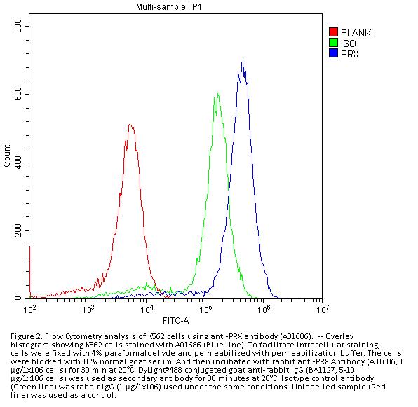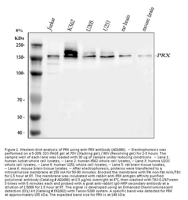 Boster Bio Anti-PRX Antibody Picoband® catalog # A01686. Tested in ELISA, Flow Cytometry, WB applications. This antibody reacts with Human, Mouse, Rat. The brand Picoband indicates this is a premium antibody that guarantees superior quality, high affinity, and strong signals with minimal background in Western blot applications. Only our best-performing antibodies are designated as Picoband, ensuring unmatched performance.