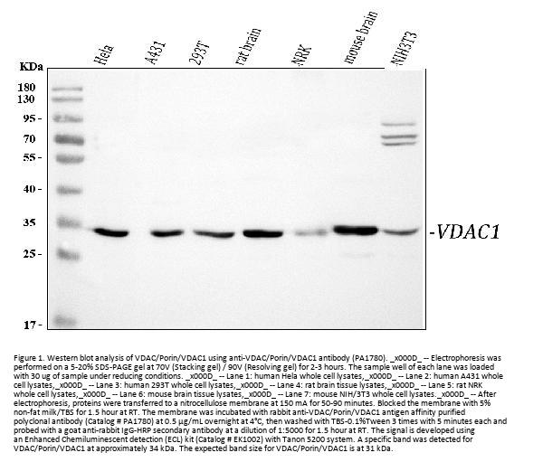 Similar products N2441 antibody, OMP2 antibody, POR1 antibody, hVDAC1 antibody, MGC111064 antibody, Mitochondrial Porin antibody, Outer mitochondrial membrane protein porin 1 antibody, Plasmalemmal porin antibody, Porin 31 HL antibody, Porin 31HL antibody, Porin 31HM antibody, VDAC 1 antibody, VDAC antibody, VDAC-1 antibody, VDAC1 antibody, VDAC1_HUMAN antibody, Voltage dependent anion channel 1 antibody, Voltage dependent anion selective channel protein 1 antibody, Voltage-dependent anion-selective channel protein 1 antibody, YNL055C antibody, YNL2441C antibody