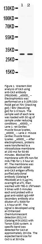 Boster Bio Anti-Carbonic Anhydrase III/CA3 Antibody Picoband® catalog # PB10049. Tested in IHC, WB applications. This antibody reacts with Human, Mouse, Rat. The brand Picoband indicates this is a premium antibody that guarantees superior quality, high affinity, and strong signals with minimal background in Western blot applications. Only our best-performing antibodies are designated as Picoband, ensuring unmatched performance.