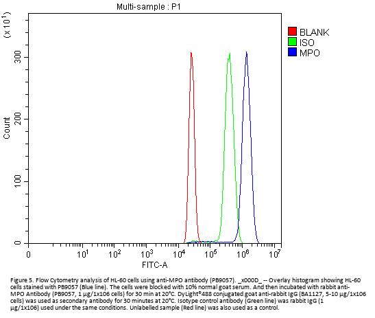Boster Bio Anti-Myeloperoxidase/MPO Antibody Picoband® catalog # PB9057. Tested in Flow Cytometry, IHC, WB applications. This antibody reacts with Human. The brand Picoband indicates this is a premium antibody that guarantees superior quality, high affinity, and strong signals with minimal background in Western blot applications. Only our best-performing antibodies are designated as Picoband, ensuring unmatched performance.