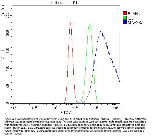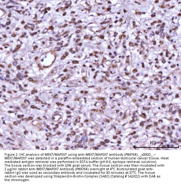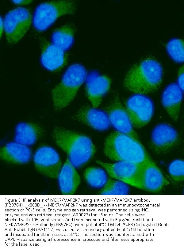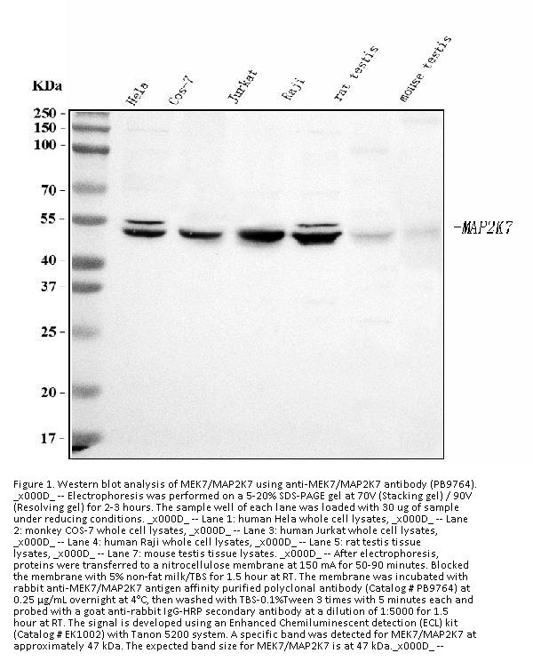 Boster Bio Anti-MEK7/MAP2K7 Antibody Picoband® catalog # PB9764. Tested in Flow Cytometry, IF, IHC, ICC, WB applications. This antibody reacts with Human, Monkey, Mouse, Rat. The brand Picoband indicates this is a premium antibody that guarantees superior quality, high affinity, and strong signals with minimal background in Western blot applications. Only our best-performing antibodies are designated as Picoband, ensuring unmatched performance.