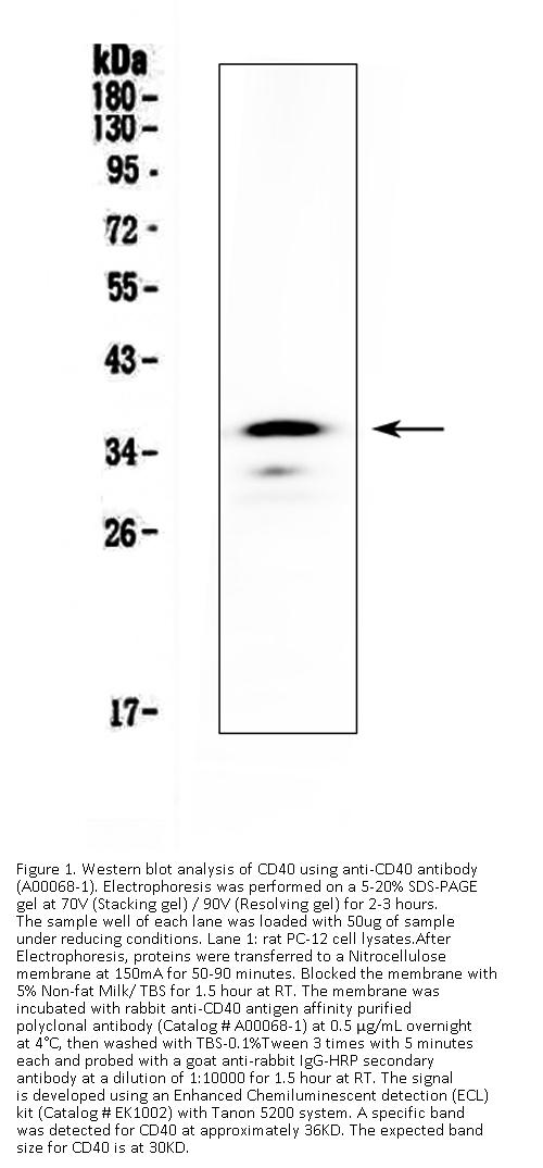 Boster Bio Anti-CD40/Cd40 Antibody Picoband® catalog # A00068-1. Tested in ELISA, WB applications. This antibody reacts with Mouse, Rat. The brand Picoband indicates this is a premium antibody that guarantees superior quality, high affinity, and strong signals with minimal background in Western blot applications. Only our best-performing antibodies are designated as Picoband, ensuring unmatched performance.