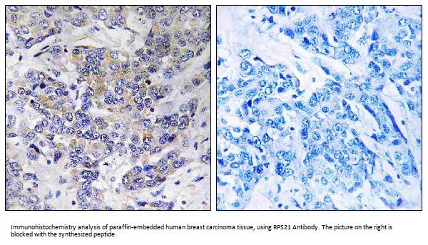 Boster Bio Anti-RPS21/Ribosomal Protein S21 Antibody (Catalog# A10068). Tested in IHC-P, IF (paraffin), ELISA applications. This antibody reacts with Human, Mouse, Rat.