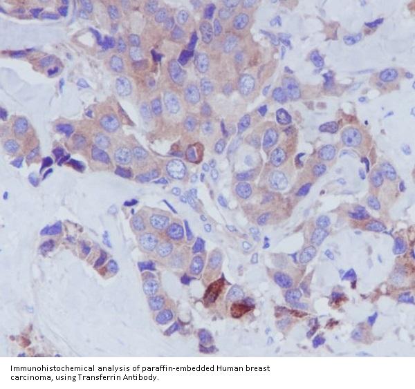 Transferrins are iron binding transport proteins which can bind two Fe (3+) ions in association with the binding of an anion, usually bicarbonate. It is responsible for the transport of iron from sites of absorption and heme degradation to those of storage and utilization. Serum transferrin may also have a further role in stimulating cell proliferation.