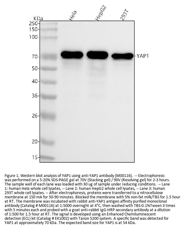 Boster Bio Anti-YAP1/Yap Rabbit Monoclonal Antibody catalog # M00116. Tested in WB, IHC, ICC/IF, IP, Flow Cytometry applications. This antibody reacts with Human.