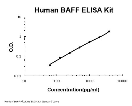 BAFF was regularly detected by enzyme-linked immunosorbent assay in brain tissue lysates and in normal spinal fluid, and in astrocytes by double fluorescence microscopy. BAFF was localized in astrocytes close to BAFF-R-expressing immune cells. BAFF receptors were strongly expressed in situ in primary central nervous system (CNS) lymphomas.1 The TNF superfamily member B cell-activating factor (BAFF) plays an important role in humoral immunity and in autoimmune diseases, including RA.Local BAFF gene targeting inhibited proinflammatory cytokine expression, suppressed generation of plasma cells and Th17 cells, and markedly ameliorated joint pathology.2 The B cell activating factor BAFF (BlyS/TALL-1/zTNF4) is a tumor necrosis factor (TNF)-related ligand that promotes B cell survival and binds to three receptors (BCMA, TACI, and the recently described BAFF-R).3 Human BAFF was mapped to chromosome 13q32-34.4 The standard used in this kit is recombinant soluble human BAFF (A134-L295) with the molecular mass of 19.6KDa.