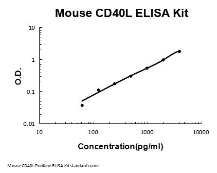 Mouse CD40 Ligand/TNFSF5/CD40LG ELISA Kit PicoKine® (96 Tests). Quantitate Mouse Cd40lg in cell culture supernatants, cell lysates, serum and plasma (heparin, EDTA). Sensitivity: 10pg/ml. The brand Picokine indicates this is a premium quality ELISA kit. Each Picokine kit delivers precise quantification, high sensitivity, and excellent reproducibility. Only our most reliable and effective kits qualify as Picokine, guaranteeing top-tier results for your assays.