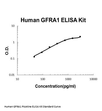 Human GFRA1 ELISA Kit PicoKine® (96 Tests). Quantitate Human GFRA1 in cell culture supernatants, serum and plasma (heparin, EDTA, citrate). Sensitivity: 20pg/ml. The brand Picokine indicates this is a premium quality ELISA kit. Each Picokine kit delivers precise quantification, high sensitivity, and excellent reproducibility. Only our most reliable and effective kits qualify as Picokine, guaranteeing top-tier results for your assays.