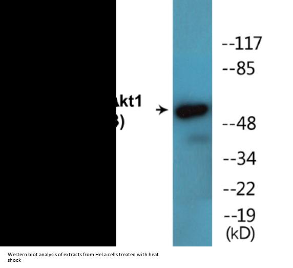 AKT1 is one of 3 closely related serine/threonine- protein kinases (AKT1, AKT2 and AKT3) called the AKT kinase, and which regulate many processes including metabolism, proliferation, cell survival, growth and angiogenesis. This is mediated through serine and/or threonine phosphorylation of a range of downstream substrates. Over 100 substrate candidates have been reported so far, but for most of them, no isoform specificity has been reported. AKT is responsible of the regulation of glucose uptake by mediating insulin-induced translocation of the SLC2A4/GLUT4 glucose transporter to the cell surface. Phosphorylation of PTPN1 at 'Ser-50' negatively modulates its phosphatase activity preventing dephosphorylation of the insulin receptor and the attenuation of insulin signaling. Phosphorylation of TBC1D4 triggers the binding of this effector to inhibitory 14-3-3 proteins, which is required for insulin-stimulated glucose transport. AKT regulates also the storage of glucose in the form of glycogen by phosphorylating GSK3A at 'Ser-21' and GSK3B at 'Ser-9', resulting in inhibition of its kinase activity. Phosphorylation of GSK3 isoforms by AKT is also thought to be one mechanism by which cell proliferation is driven. AKT regulates also cell survival via the phosphorylation of MAP3K5 (apoptosis signal-related kinase). Phosphorylation of 'Ser-83' decreases MAP3K5 kinase activity stimulated by oxidative stress and thereby prevents apoptosis. AKT mediates insulin-stimulated protein synthesis by phosphorylating TSC2 at 'Ser-939' and 'Thr-1462', thereby activating mTORC1 signaling and leading to both phosphorylation of 4E-BP1 and in activation of RPS6KB1. AKT is involved in the phosphorylation of members of the FOXO factors (Forkhead family of transcription factors), leading to binding of 14-3-3 proteins and cytoplasmic localization. In particular, FOXO1 is phosphorylated at 'Thr-24', 'Ser-256' and 'Ser-319'. FOXO3 and FOXO4 are phosphorylated on equivalent sites. AKT has an important role in the regulation of NF-kappa-B-dependent gene transcription and positively regulates the activity of CREB1 (cyclic AMP (cAMP)- response element binding protein). The phosphorylation of CREB1 induces the binding of accessory proteins that are necessary for the transcription of pro-survival genes such as BCL2 and MCL1. AKT phosphorylates 'Ser-454' on ATP citrate lyase (ACLY), thereby potentially regulating ACLY activity and fatty acid synthesis. Activates the 3B isoform of cyclic nucleotide phosphodiesterase (PDE3B) via phosphorylation of 'Ser-273', resulting in reduced cyclic AMP levels and inhibition of lipolysis. Phosphorylates PIKFYVE on 'Ser-318', which results in increased PI (3)P-5 activity. The Rho GTPase-activating protein DLC1 is another substrate and its phosphorylation is implicated in the regulation cell proliferation and cell growth. AKT plays a role as key modulator of the AKT-mTOR signaling pathway controlling the tempo of the process of newborn neurons integration during adult neurogenesis, including correct neuron positioning, dendritic development and synapse formation. Signals downstream of phosphatidylinositol 3-kinase (PI (3)K) to mediate the effects of various growth factors such as platelet-derived growth factor (PDGF), epidermal growth factor (EGF), insulin and insulin-like growth factor I (IGF-I). AKT mediates the antiapoptotic effects of IGF-I. Essential for the SPATA13-mediated regulation of cell migration and adhesion assembly and disassembly. May be involved in the regulation of the placental development. Phosphorylates STK4/MST1 at 'Thr-120' and 'Thr-387' leading to inhibition of its: kinase activity, nuclear translocation, autophosphorylation and ability to phosphorylate FOXO3. Phosphorylates STK3/MST2 at 'Thr- 117' and 'Thr-384' leading to inhibition of its: cleavage, kinase activity, autophosphorylation at Thr-180, binding to RASSF1 and nuclear translocation. Phosphorylates SRPK2 and enhances its kinase activity towards SRSF2 and ACIN1 and promotes its nuclear translocation. Phosphorylates RAF1 at 'Ser-259' and negatively regulates its activity. Phosphorylation of BAD stimulates its pro- apoptotic activity. Phosphorylates KAT6A at 'Thr-369' and this phosphorylation inhibits the interaction of KAT6A with PML and negatively regulates its acetylation activity towards p53/TP53.
