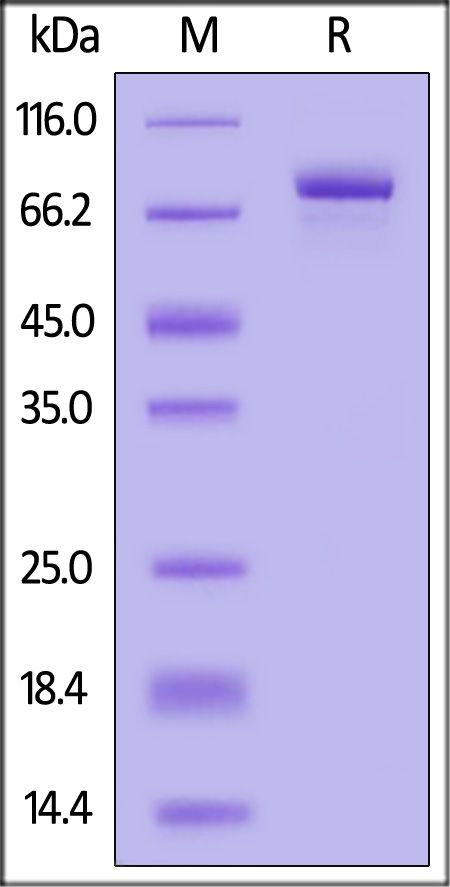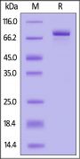 This protein carries a human IgG1 Fc tag at the C-terminus, followed by an Avi tag (Avitag™). The protein has a calculated MW of 69.1 kDa. The protein migrates as 80-90 kDa under reducing (R) condition (SDS-PAGE) due to glycosylation.