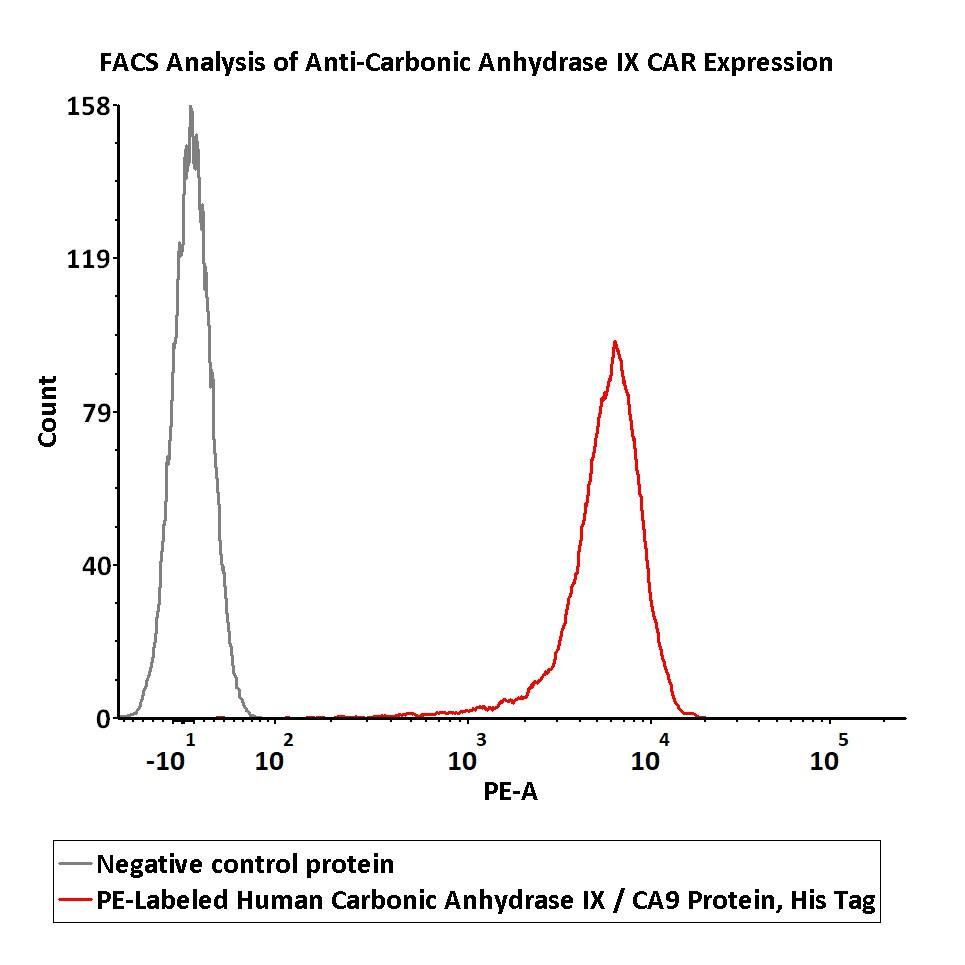 PE-Labeled Human Carbonic Anhydrase IX (38-414), His Tag (CA9-HP2H6) is produced via site-specific conjugation of PE to Human Carbonic Anhydrase IX (38-414), His Tag under optimal conditions with a proprietary technology. Human Carbonic Anhydrase IX (38-414), His Tag is expressed from human 293 cells (HEK293). It contains AA Gln 38 - Asp 414 (Accession # Q16790-1).