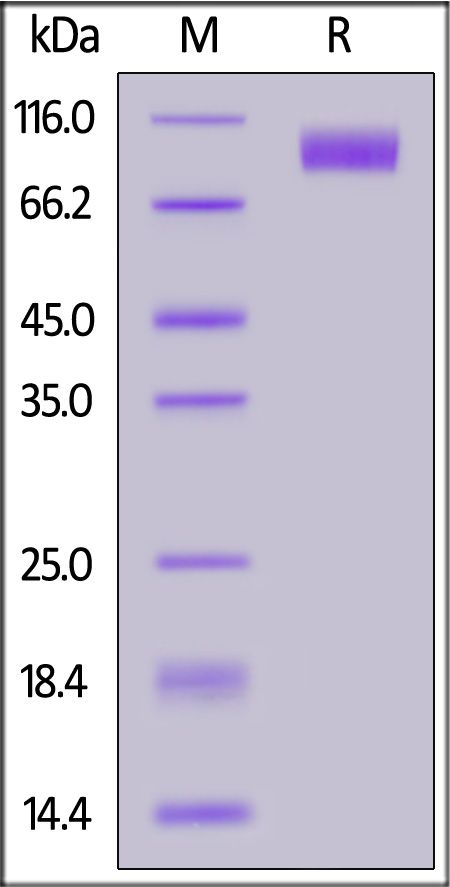 This protein carries a human IgG1 Fc tag at the C-terminus, followed by an Avi tag (Avitag™). The protein has a calculated MW of 66.6 kDa. The protein migrates as 80-115 kDa under reducing (R) condition (SDS-PAGE) due to glycosylation.