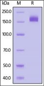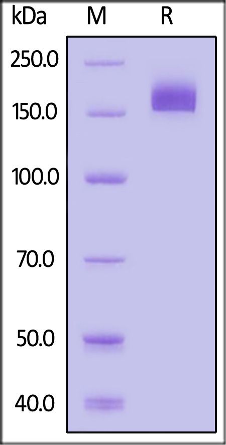 This protein carries a polyhistidine tag at the C-terminus. The protein has a calculated MW of 125.1 kDa. The protein migrates as 160-200 kDa under reducing (R) condition (SDS-PAGE) due to glycosylation.