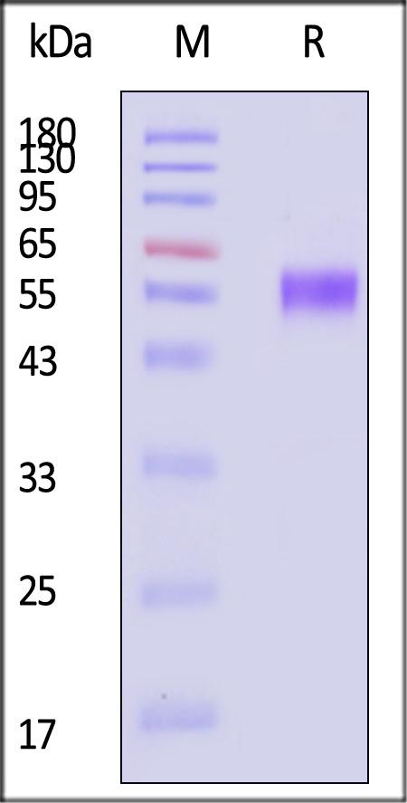 This protein carries a polyhistidine tag at the C-terminus, followed by an Avi tag (Avitag™). The protein has a calculated MW of 41.4 kDa. The protein migrates as 53-63 kDa when calibrated against Star Ribbon Pre-stained Protein Marker under reducing (R) condition (SDS-PAGE) due to glycosylation.