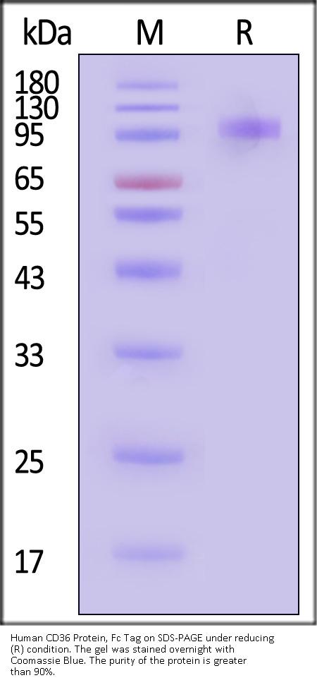 This protein carries a human IgG1 Fc tag at the C-terminus. The protein has a calculated MW of 73.1 kDa. The protein migrates as 95-120 kDa when calibrated against Star Ribbon Pre-stained Protein Marker under reducing (R) condition (SDS-PAGE) due to glycosylation.