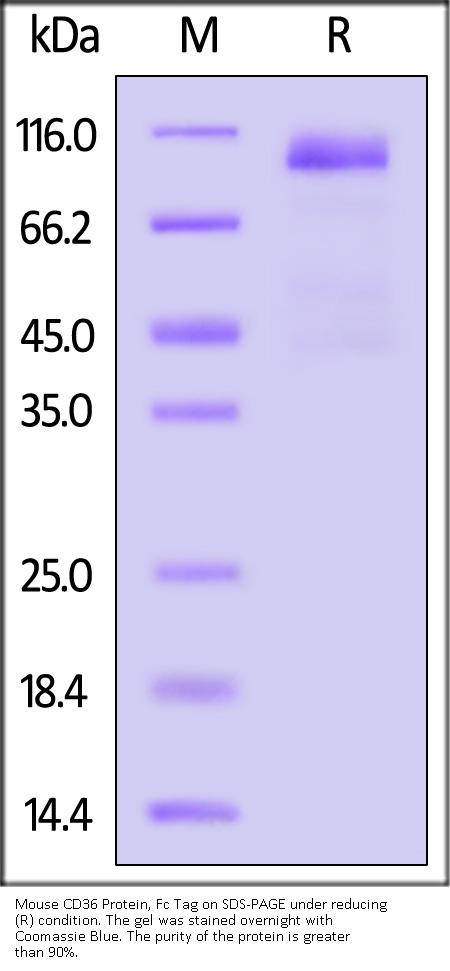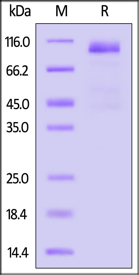 This protein carries a human IgG1 Fc tag at the C-terminus. The protein has a calculated MW of 72.8 kDa. The protein migrates as 95-110 kDa under reducing (R) condition (SDS-PAGE) due to glycosylation.