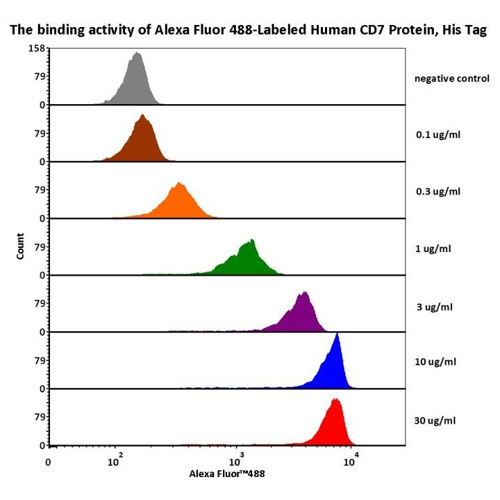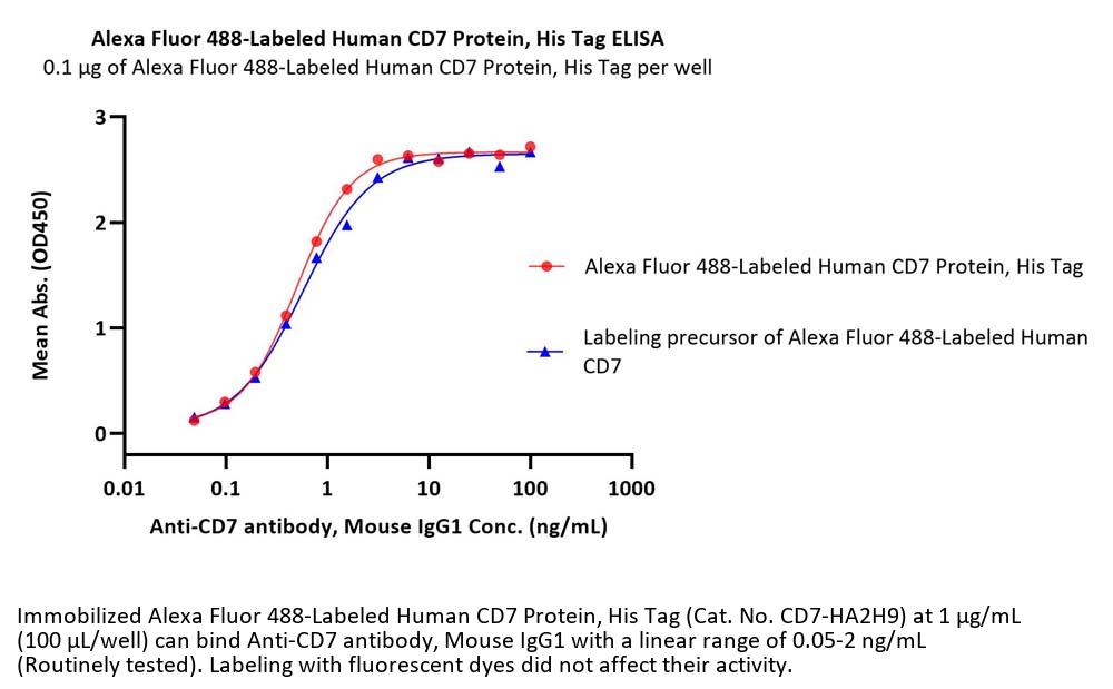Alexa Fluor 488-Labeled Human CD7 Protein, His Tag (CD7-HA2H9) is produced via conjugation of AF488 to Human CD7 Protein, His Tag with a new generation site-specific technology under Star Staining labeling platform. Human CD7 Protein, His Tag is expressed from human 293 cells (HEK293). It contains AA Ala 26 - Pro 180 (Accession # P09564-1).