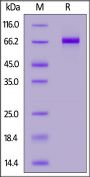 This protein carries a human IgG1 Fc tag at the C-terminus, followed by an Avi tag (Avitag™). The protein has a calculated MW of 58.0 kDa. The protein migrates as 65-75 kDa when calibrated against Star Ribbon Pre-stained Protein Marker under reducing (R) condition (SDS-PAGE) due to glycosylation.