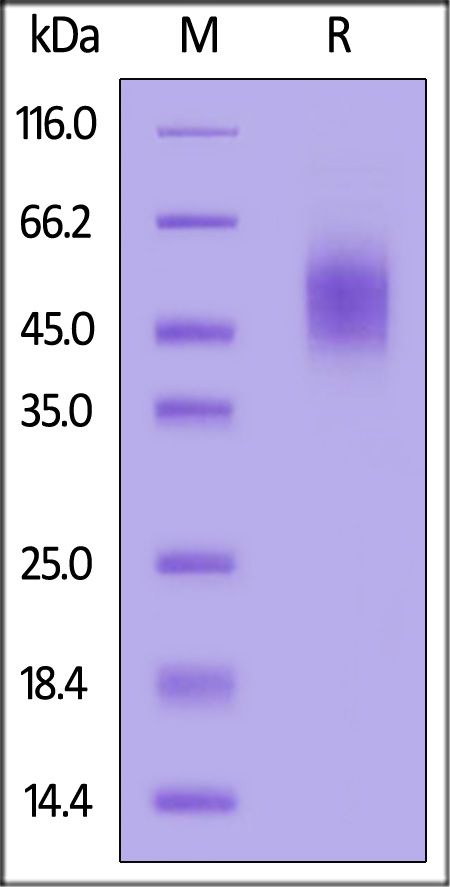 This protein carries a polyhistidine tag at the C-terminus. The protein has a calculated MW of 32.3 kDa. The protein migrates as 45-60 kDa under reducing (R) condition (SDS-PAGE) due to glycosylation.