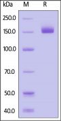 This protein carries a polyhistidine tag at the C-terminus, followed by an Avi tag (Avitag™). The protein has a calculated MW of 143.5 kDa. The protein migrates as 150-170 kDa under reducing (R) condition (SDS-PAGE) due to glycosylation.