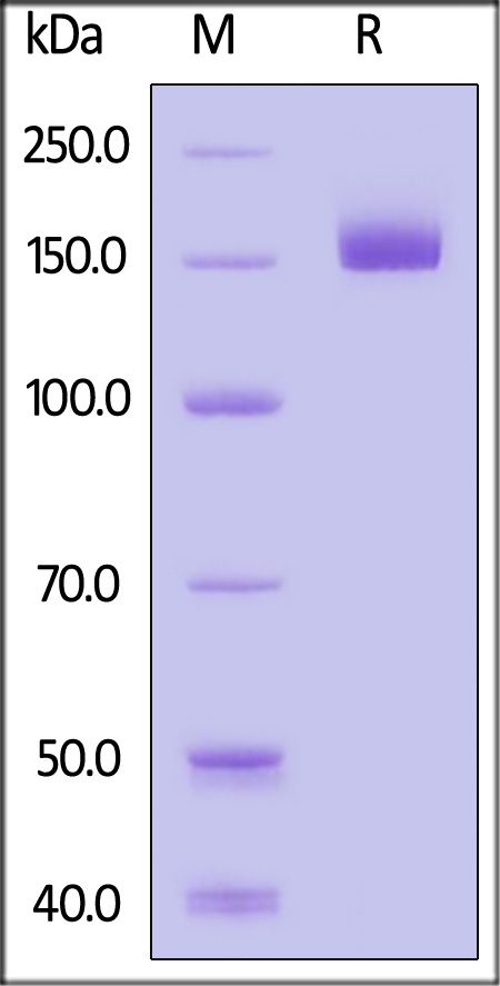 This protein carries a polyhistidine tag at the C-terminus, followed by an Avi tag (Avitag™). The protein has a calculated MW of 143.5 kDa. The protein migrates as 150-170 kDa under reducing (R) condition (SDS-PAGE) due to glycosylation.