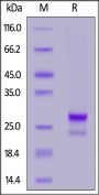 This protein carries a polyhistidine tag at the C-terminus, followed by an Avi tag (Avitag™). The protein has a calculated MW of 13.7 kDa. The protein migrates as 22 kDa and 27 kDa under reducing (R) condition (SDS-PAGE) due to glycosylation.