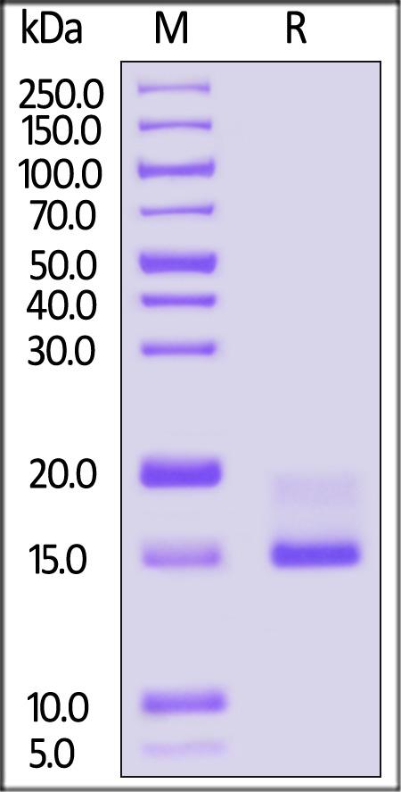 This protein carries a polyhistidine tag at the C-terminus, followed by an Avi tag (Avitag™). The protein has a calculated MW of 13.3 kDa. The protein migrates as 15 kDa under reducing (R) condition (SDS-PAGE) due to glycosylation.
