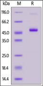 This protein carries a human IgG1 Fc tag at the C-terminus. The protein has a calculated MW of 36.2 kDa. The protein migrates as 45-55 kD under reducing (R) condition (SDS-PAGE) due to glycosylation.
