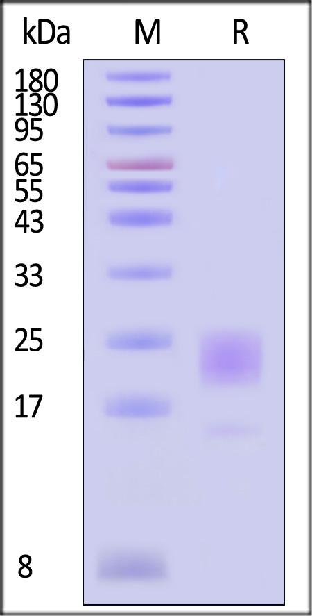 This protein carries a polyhistidine tag at the C-terminus. The protein has a calculated MW of 14.4 kDa. The protein migrates as 16 kDa and 19-26 kDa when calibrated against Star Ribbon Pre-stained Protein Marker under reducing (R) condition (SDS-PAGE) due to glycosylation.