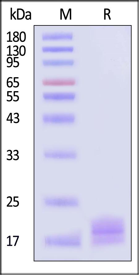 This protein carries a polyhistidine tag at the C-terminus. The protein has a calculated MW of 16.7 kDa. The protein migrates as 19-25 kDa when calibrated against Star Ribbon Pre-stained Protein Marker under reducing (R) condition (SDS-PAGE) due to glycosylation.