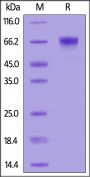 This protein carries a polyhistidine tag at the C-terminus. The protein has a calculated MW of 49.0 kDa. The protein migrates as 60-70 kDa under reducing (R) condition (SDS-PAGE) due to glycosylation.