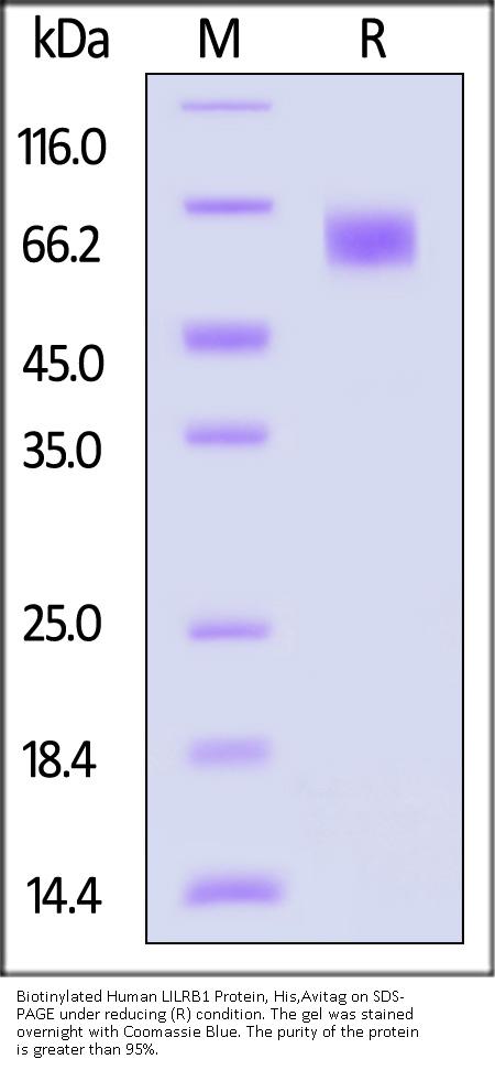 This protein carries a polyhistidine tag at the C-terminus, followed by an Avi tag (Avitag™). The protein has a calculated MW of 48.2 kDa. The protein migrates as 52-64 kDa under reducing (R) condition (SDS-PAGE) due to glycosylation.