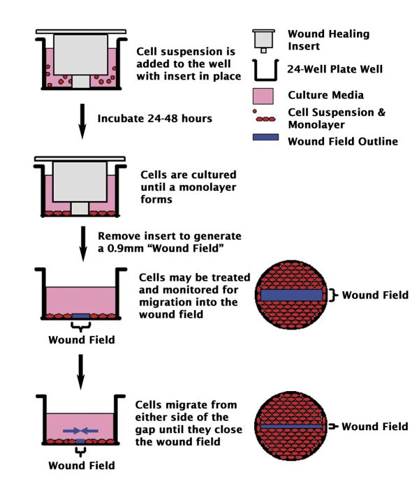 Traditionally scratch assays have been used to study cell migration, cell proliferation and wound healing. However, these assays lack a consistently defined wound gap and can result in high inter-sample variation. Our CytoSelect™ 24-Well Wound Healing Assay provides a much more consistent method to measure cell migration across a wound field gap in vitro. Proprietary inserts generate a consistent 0.9mm wound gap between the cells. Cells may then be treated or monitored for proliferation or migration across the wound field by imaging samples at fixed time points or by time-lapse microscopy.