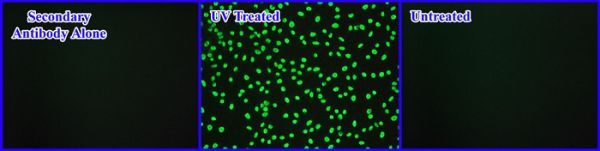 Our OxiSelect Cellular UV-induced DNA Damage Staining Kit measures the formation of cyclobutane pyrimidine dimers (CPD) by Immunofluorescence. Cells are first seeded In a 96-well tissue culture plate. Wells are then UV Irradiated to Induce DNA damage. After fixation and denaturation, cells containing the DNA lesions are probed with an anti-CPD antibody, followed by a FiTC conjugated secondary antibody. The unbound secondary antibody Is removed during a wash step, and stained cells can then be visualized with a fluorescence microscope.
